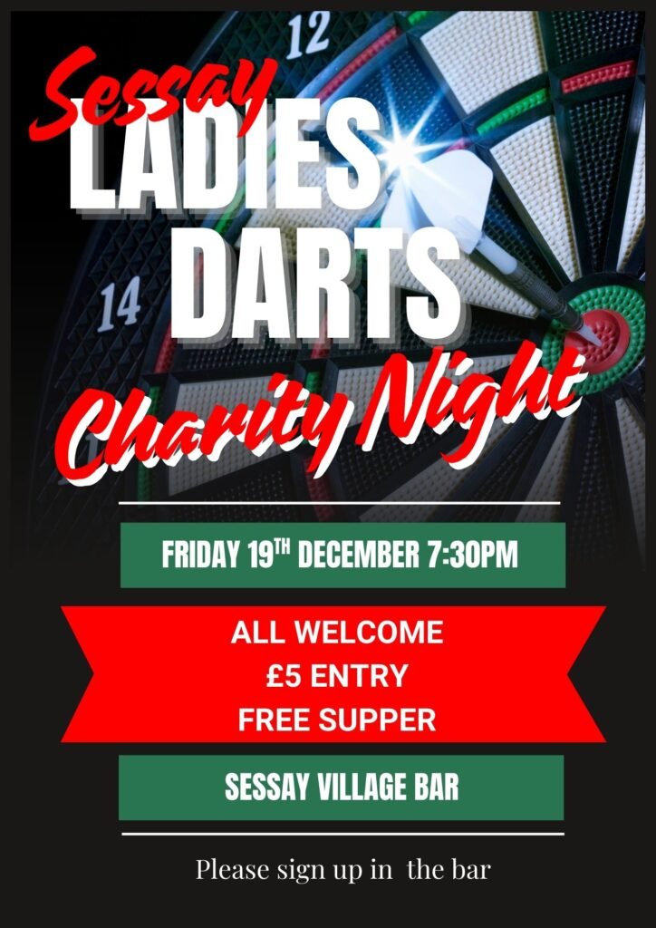 The Ladies Darts team are holding their annual darts charity night in aid of the Village Hall Darts competition, supper, and raffle. £5 entry including supper. Please either sign up in the bar beforehand (sheets available) or let Doreen know on 07890 112453 or email.