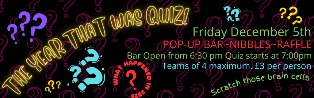 Put your grey matter to the test in our “Year that Was” Quiz. A fun evening trying to remember what happened in 2025. Pup-up Bar. Raffle. Nibbles. £3 per person. Max 4 per team.