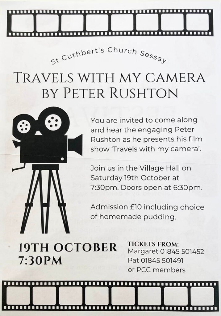 St Cuthbert’s Church Sessay would like to invite you to an entertaining evening illustrated talk by local camera man Peter Rushton. The evening will be accompanied by the opportunity to sample a range of puddings! Tickets are £10 from Margaret 01845 501452 or Pat 01845 501491